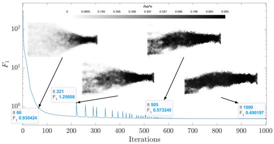 Evolution of the objective function during the optimization process described in Section 4.2 to solve problem . The small peaks correspond to the increase in the penalty parameter n.