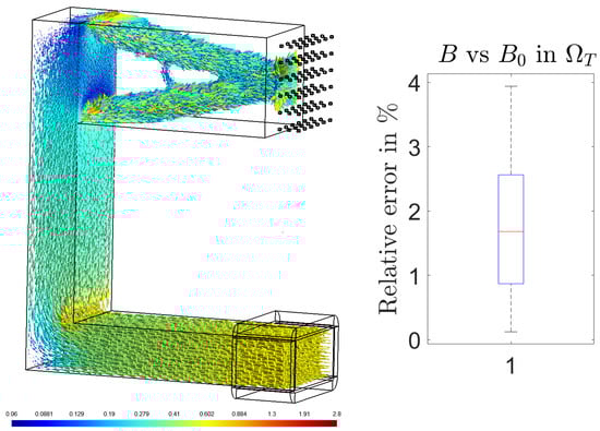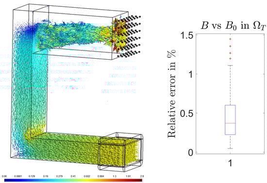 (left) Magnetic field inside the simulation domain for . (right) Boxplot of the relative error between these two fields inside the 216 cubes which discretize (as explained in Section 4.1).