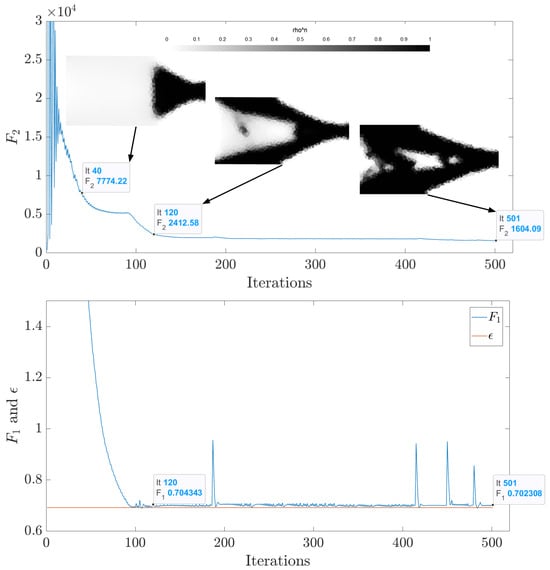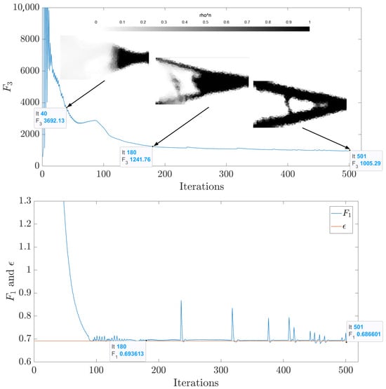 in which is the compliance of the mechanical structure as defined in Equation (9) and is a small value taken such that corresponds to an error of for each cube in the target zone . The same algorithm as in Section 4.2 was used following the continuation method explained in Remark 3 (except that only 500 iterations are necessary). Figure 7 shows the evolution of the objective function and constraint over the course of the optimization process.