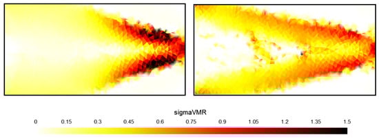 Once again, we can see significant differences between this design and the one previously obtained for the compliance minimization with a much finer shape joining the top and bottom slabs. We now have a relative magnetic error of no more than in the target zone . In detail, Figure 11 shows the von Mises stress inside the optimized design of and . If the objective function is the compliance (), then the stress measure is higher and more concentrated than the case where the objective function is the relaxed von Mises stress (), which leads to a more uniform distribution of .