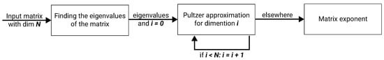 Numerical computation of MEs using L-EXPM is aimed to reduce the error in computing MEs for any given complex square matrix. L-EXPM is based on Putzer’s algorithm [] for the decomposition of MEs. L-EXPM handles two steps of the original algorithm from a numerical perspective. First, it finds the eigenvalues of the input matrix (M). This is not a trivial task, especially for large-size matrices. However, recent power methods, such as the Lanczos algorithm [], are able to obtain the needed eigenvalues with decent accuracy. Second, rather than solving a system of ODEs recursively to obtain the coefficients of the decomposed matrices, the coefficients are iteratively approximated via an analytical solution of the system of ODEs. A schematic view of the algorithm’s structure is shown in Figure 1.