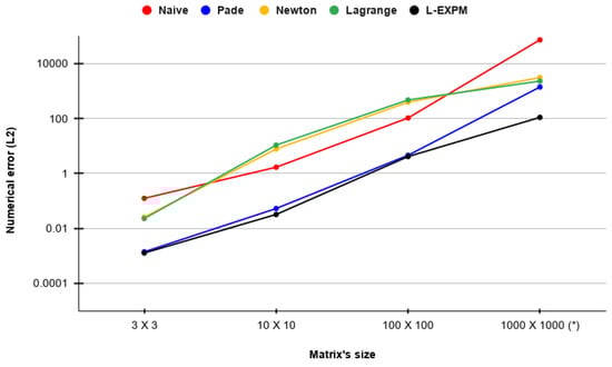 Equation (2) is also known as the naive ME algorithm. It is numerically unstable, slow, and relatively inaccurate when considering floating-point arithmetic []. Recently, in the context of modern computer systems, numerical computation of MEs has become more relevant than ever before [,]. One of the main challenges associated with computing MEs is the numerical accuracy for any given matrix [].