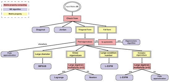 One can roughly divide the numerical ME algorithms into two groups: algorithms designed specifically to exploit a property of some groups of matrices (for example, diagonal matrices) and algorithms that are suitable for all matrices. Usually, when one uses an algorithm from the first group, the obtained result is accurate and the computation is stable since the algorithm is explicitly designed to handle the given input matrix. If, for some reason, one uses an inappropriate matrix in such an algorithm, the algorithm more often than not produces a (highly) incorrect result. Algorithms from the second group are usually found in large computational systems as they do not require that the result of the computation, which takes place before the computation of the ME algorithm, satisfies a given condition. This general nature makes these algorithms usable in a wider context []. However, each algorithm in this group has a set of matrices that result in large errors or even divergence during computation [].