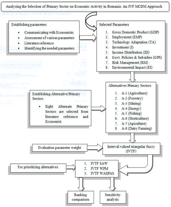Hence, it is very important to study the primary sectors that directly or indirectly influence the Romanian economy. This research aims to identify the potential primary sectors and rate them according to their effect on the Romanian economy. Romania faces unique challenges and opportunities in its primary sector activities, ranging from agricultural modernization and industrial diversification to environmental sustainability and technological innovation [10]. This research seeks to address these challenges and leverage opportunities by providing insights into sectoral performance and identifying areas for improvement. In an increasingly globalized and uncertain economic landscape, enhancing the resilience of primary sectors is essential for mitigating risks and adapting to changing market conditions. By analyzing sectoral performance under different scenarios and considering external factors such as political events or international trade dynamics, this research aims to contribute to the development of robust and adaptive economic strategies. Moreover, the selection of primary sectors involves complex decision-making processes that consider various economic, social, environmental, and political factors. By employing an IVF-MCDM approach, this research aims to provide a structured framework for analyzing and prioritizing primary sectors effectively [11]. Therefore, the motivation behind this research is to provide actionable insights and decision support tools that can inform strategic interventions aimed at strengthening Romania’s primary sector activities, driving economic growth, and promoting sustainable development.