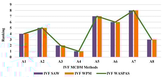 The following section highlights the comparisons of the present rankings with other methods to observe any differences in the outcome results. To prove the robustness of the present hybrid model, traditional SAW, WPM and WASPAS without considering fuzzy were further applied and the alterations in the output rankings were observed. It is to be noted from Table 15 that the alternative rankings vary across the three traditional MCDM tools. Although conventional SAW and WASPAS prescribe the same ranking order, the ranking proposed by traditional WPM is completely different, thus indicating the instability and lack of cooperation among these three traditional methods. On the other hand, when IVF is integrated with SAW, WPM and WASPAS, the ranking order is modified and the stability is further enhanced, thus producing the same ranking across the three methods as evident from Table 15. The variations in the ranking order among the applied MCDM methods are also illustrated graphically in Figure 6.