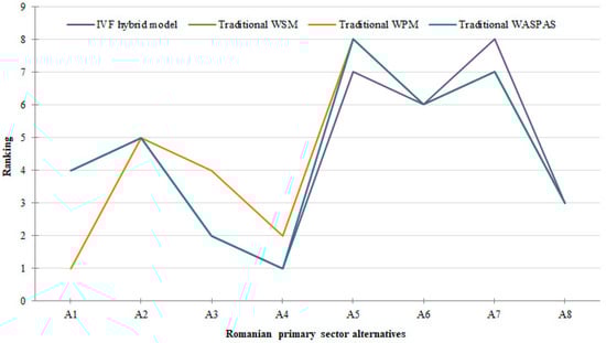 IVF integrated with SAW, WPM, and WASPAS MCDM techniques offer a comprehensive and flexible framework for addressing the challenges that Romania faces in primary sector selection [12,13]. By providing robust decision support tools that handle uncertainty, integrate multiple criteria, facilitate sensitivity analysis, and incorporate expert judgment, these techniques empower decision-makers to make informed and effective decisions that drive economic growth and development in Romania’s primary sectors.