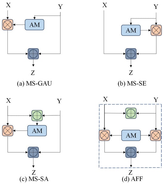 Although there are many differences in implementation between various methods for feature fusion in different scenarios, once abstracted as mathematical forms, these differences in detail disappear. Therefore, to be applicable to most common scenarios, [22] proposed a unified general protocol called Attention Feature Fusion (AFF), as shown in Figure 1d, where the dotted line represents . Based on SE, AFF can be represented as follows: