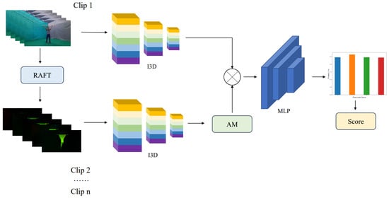 The network structure proposed in this paper is shown in Figure 2. The FMS video stream to be tested is input into the network. Afterwards, the video stream is input into the network in the form of a sliding window, and the RGB stream of the video is extracted. Furthermore, the RAFT algorithm is used to process video optical flow estimation. This generates a set of optical flow images that represent the motion between consecutive frames of a video. These optical flow images are then input into the I3D model, aiming to capture spatiotemporal features from the image sequence. The original video frames are also processed by the same I3D model to capture spatial features. However, it should be noted that the optical flow information is not included in the model for training and updating parameters.