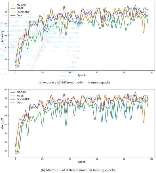 In this section, we compared our method with current popular video quality assessment algorithms and conducted an empirical analysis using the FMS dataset. Based on complete experimental data, as shown in Figure 3, (a) and (b), respectively, represent the data changes in Macro_ and Accuracy in MS-GAU, MS-SE, RESNET-MLP, and our method. The horizontal axis (Epoch) of the coordinate system represents the number of training epochs for all samples in the training set, and the vertical axis of (a) and (b), respectively, represents the values of the two evaluation metrics mentioned above. The experimental method in this paper reached its optimum at the 89th epoch, with Macro_ and Accuracy reaching 88.89% and 88.95%, respectively. It can be seen from the figure that when training using MS-SE along with our method, the fitting speed is fast. However, when using MS-GAU and RESNET-MLP, the fitting speed is too slow. This indicates that self-fusion using optical flow can better extract the spatiotemporal features of FMS. In addition, the method proposed in this paper is more stable in terms of the variation in evaluation metrics during the training process compared to MS-SE.