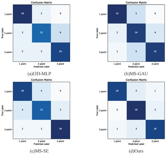 As shown in Figure 4, the x-axis represents the predicted scores of the model, while the y-axis represents the actual scores. The terms “1 point”, “2 point”, and “3 point” correspond to the three levels of FMS scoring. The “0 point” is considered abnormal and should be directly ignored. The sum of elements in each row in the figure reflects the actual number of samples in the corresponding class. By comparing the results of four different methods (with the diagonal representing the correct matched class), we can clearly see that the protocol proposed in this paper has the highest number of correct recognitions (26, 28, and 26, respectively). This result demonstrates that the method yielded performance superior to the other three leading techniques and shows more excellent classification outcomes than those of the other two feature fusion protocols, MS-GAU and MS-SE. This result confirms the high accuracy and reliability of our model in understanding and evaluating movements. We believe that this improvement in performance is due to the model’s ability to capture fine-grained dynamic features and effectively encode complex movement sequences. This will help further enhance the performance and usability of the model in future research.
