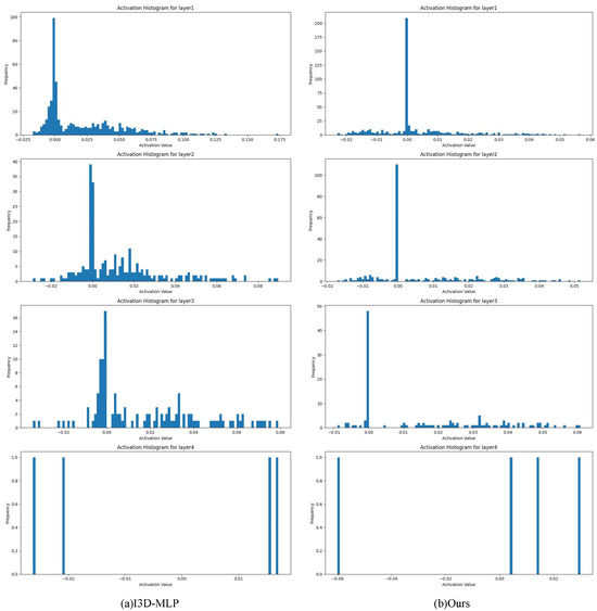 The activation histograms for the MLP layers of the model are presented in Figure 5. Both models have four layers in their MLP, with the linear layer sizes changing as [1024, 512, 256, 128, 4]. The horizontal axis represents the activation values of the neural network layers, which are the outputs of the neurons. The vertical axis indicates the frequency of occurrence of neuron outputs within a specific activation value or range of activation values. Typically, it is desirable for activation values to have a certain level of diversity, avoiding concentration on specific values. However, as seen in Figure 5, the activation values in Figure 5b are more concentrated compared to those in Figure 5a, yet the model’s performance is better. This suggests that the model has learned effective feature representations within specific activation ranges. Even if the activation values are concentrated, as long as they can effectively distinguish between different classes, the model’s performance can still be good. The model uses ReLU activation functions, which alleviate the vanishing gradient problem and allow the network to learn deep representations. Even if the activation values appear concentrated in some layers, the overall network is still able to effectively propagate gradients and learn.