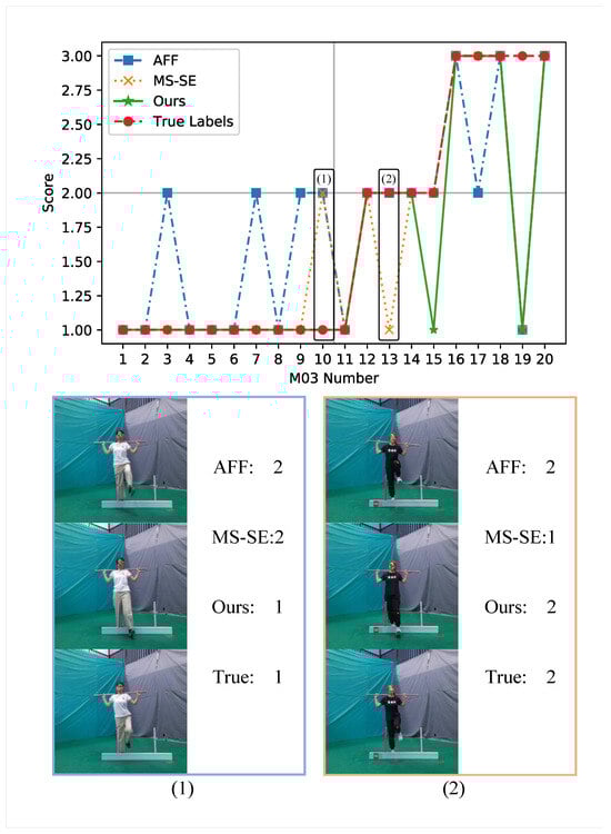 To demonstrate the comparison of our method with other protocols, we selected 20 results from the M03 class movements for visualization and compared them with the AFF and MS-SE methods. As shown in Figure 6, the line graph above shows the results of AFF, MS-SE, Ours, and the ground truth labels. By observing the results in the graph, we can see that the AFF method shows significant deviations from the ground truth labels at multiple points. This indicates that this complex fusion method is not suitable for the merging of dual streams in FMS. On the contrary, the method proposed in this paper can better match the ground truth labels, with only a few errors observed in classification 3. Figure 6. Examples of movements in two subjects classified using the method proposed in this paper. In (1), the movements of the subjects that should be assigned a score of 1 are misclassified as a score of 2 by AFF and MS-SE. In (2), the movements of the subjects that should be assigned a score of 2 are misclassified as a score of 1 by MS-SE. In contrast, the method proposed in this paper can accurately recognize cases where the subject’s foot is not placed flat in movement M03 and assign a score to the movement in the correct classification.