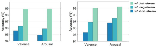 On DEAP and DREAMER, we compared our model with the SOTA methods, which use different backbones. The used models contain CRAM [20], ACRNN [42], MMResLSTM [55], DGCNN [56], IAG [26], V-IAG [29], SSTemotionNet [57], HetEmotionNet [43], EeT [54], and TNAS [6], as shown in Table 2. To ensure the comprehensiveness of the comparative experiments, these models adopt different feature selection strategies, including spatial–temporal domain features [20,55], spatial–spectral domain features [26,29,56], and the integration of spatial–spectral–temporal domain features [43,57]. Apart from this, we chose a wide range of models which include architectures featuring different combinations of CNN, RNN, LSTM, GRU, GCN, transformer, and others to comprehensively demonstrate the difference of our model compared to previous works. To ensure a fair comparison, we applied identical data preprocessing steps to both our model and the selected baseline models on both datasets and conducted comparative experiments under the same experiment conditions.