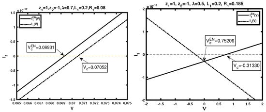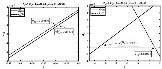 The authors in [48] employed geometric singular perturbation theory to study the PNP system with Bikerman’s model for finite ion size effects. The analysis is conducted under the assumption of electroneutrality conditions (6), and treats the system as a regular perturbation of the case where . Upon introducing and , the authors derived the approximations of the I–V relation of the following form, which is the starting point of our study.