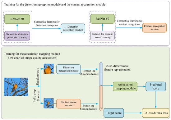 Our approach can be specifically divided into three components: (1) Distortion perception module training based on intelligent cropping and MOCO-V2 [,] contrastive learning. (2) Content recognition module training based on global cropping and MOCO-V3 [] contrastive learning. (3) Correlation mapping module training with an approach based on rank learning on image quality assessment datasets. The overall framework is shown in Figure 1.