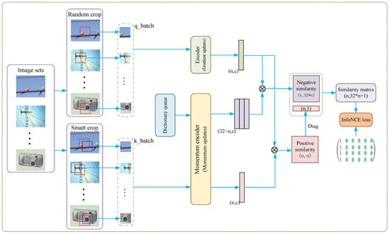 - He, K.; Fan, H.; Wu, Y.; Xie, S.; Girshick, R. Momentum contrast for unsupervised visual representation learning. In Proceedings of the IEEE/CVF Conference on Computer Vision and Pattern Recognition, Seattle, WA, USA, 13–19 June 2020; pp. 9729–9738. [Google Scholar]