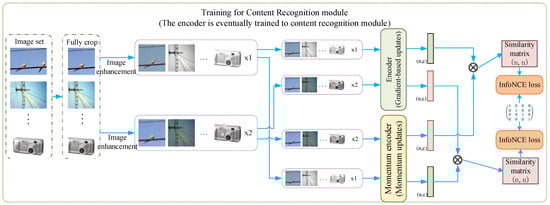During the content recognition training, we trained the content recognition module to extract the overall framework of image content and generate corresponding feature vectors. Figure 3 illustrates the contrastive learning training framework for the content recognition module based on MOCO-V3. The training of the content recognition module is performed using a dataset from ImageNet [], which contains 1.28 million images across 1000 classes. For detailed algorithm flow, refer to Algorithm 2.