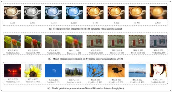 In Table 2 and Table 3, we present the validation results of various models, including the proposed McmIQA method, on both synthetic distortion datasets and natural distortion datasets. The performance of the proposed model surpasses that of four quality assessment algorithms based on traditional feature extraction followed by SVR (support vector regressor): BRISQUE [], NIQE [], CORNIA [], and HOSA []. Compared to supervised pre-trained CNN schemes, such as PQR [], DBCNN [], BIECON [], PaQ-2-PiQ [], and HyperIQA [], McmIQA also achieved superior predictive performance, benefiting from the feature extraction capabilities obtained during the pre-training phase on large-scale datasets. Additionally, when compared to models that perform feature extraction based on attention mechanisms, such as TIQA [], TRES [], and MUSIQ [], our model similarly exhibits superior performance due to the large-scale contrastive learning pre-training and collaborative mechanism. Finally, in comparison with recently proposed contrastive learning models, such as CONTRIQUE [], Re-IQA [], and QPT-ResNet50 [], the McmIQA model trained on 16GB-3080 still achieves highly competitive results. This indicates that the novel contrastive learning framework proposed in this paper and the rank training process for the correlation mapping module further enhanced the predictive performance of the resulting model. Figure 5 illustrates the model’s predictive results on various datasets.