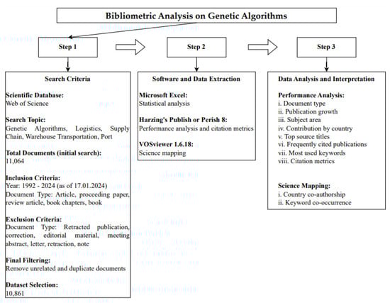 This bibliometric analysis focuses on the application of genetic algorithms in the field of logistics and supply chain management in the Web of Science database. The Web of Science database is selected for its enormous collection of peer-reviewed scientific papers with excellent indexing for research exploration []. The Web of Science database has also been widely used for bibliometric analyses [,,,,]. A bibliometric analysis on the application of genetic algorithms in the logistics and supply chain sector has also not been conducted using the Web of Science database. This bibliometric analysis follows a 3-step approach, as shown in Figure 1 [,].