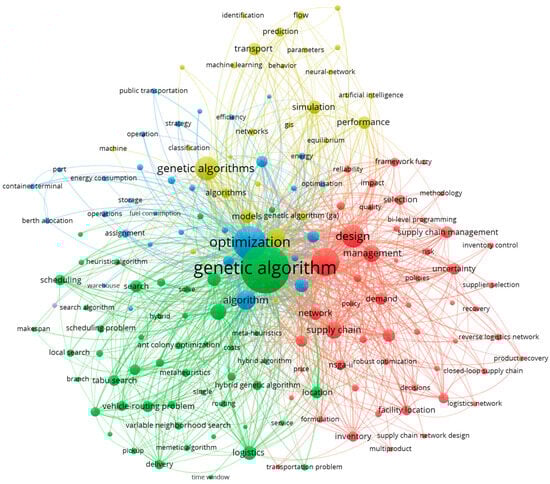 The fourth cluster is in yellow and has keywords such as artificial intelligence, artificial neural network, behavior, capacity, classification, constraints, decomposition, equilibrium, flow, fuzzy logic, geographic information system (GIS), identification, intelligent transportation system, machine learning, neural network, parameters, performance, prediction, and simulation. This cluster stresses the importance of integrating genetic algorithms with other machine learning techniques in logistics and supply chain management.