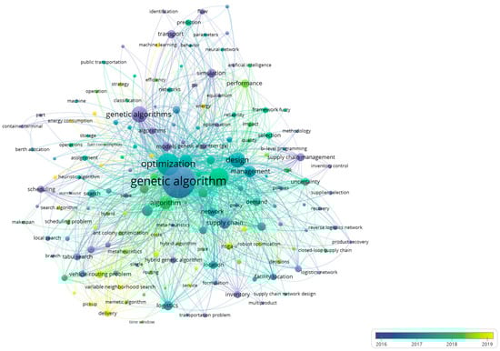 The keyword co-occurrence map and keyword overlay visualization map were generated using VOSviewer [,]. Research hotspots can be found using the keyword co-occurrence map by linking key research areas []. Table 8 lists the 20 keywords with the highest total link strengths. “Genetic algorithm” occurred 4964 times with a total link strength of 13,983, followed by “optimization” with 2285 occurrences and a total link strength of 8288 and “model” with 1596 occurrences and a total link strength of 6708. “Design” (4321), “management” (2851), “system” (2835), “algorithm” (2573), “supply chain” (2509), “transportation” (2286), and “logistics” (1803) also have high total link strengths. Figure 3 depicts a keyword co-occurrence map of genetic algorithm papers in the field of logistics and supply chain management.