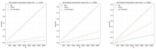 Assuming that the expression of is unknown, a formulation such as (14) obtained from seems to give no advantages without AD and/or tailored parallelization. Indeed, the computation of the gradient through classical gradient approximation methods (e.g., Finite Differences) needs N different gradient evaluations for each point , respectively, and each one of them needs function evaluations (assuming no special structures for f); then, e.g., the time complexity of the gradient approximation with Finite Differences for G (denoted by ) is