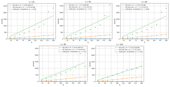 for each matrix , , and where denotes the transposed i-th row of X. In this case, especially when , using is much more time-efficient than parallelizing N computations of f, thanks to the particular data structure read by the machine workers, which is optimized according to memory allocation, data access, and workload reduction. Therefore, we easily deduce that the maximum efficiency for the AD-based method is obtained when G is built using instead of (if possible).