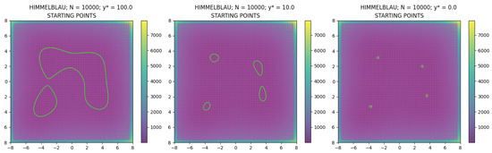 Given the MSO-NN described above, we show three cases of level-curve search: the case with (set denoted by ), the case with (set denoted by ), and the case with (set denoted by , see (26)); in particular, the latter case is equivalent to the global minimization problem of the function. For all the cases, for the multi-start method we select the points of the regular grid as starting points