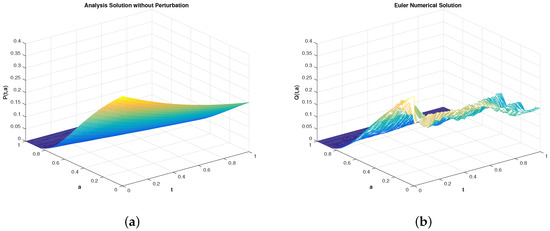As we know, the exact solution of stochastic partial differential Equation (79) is difficult to be exactly expressed. Here, we let be the “explicit solution” of Equation (79) (the simulation; see the Figure 1a) by using the characteristic line law. Figure 1b describes the EM numerical solution of Equation (79) under Markov switching. Figure 2 shows that the EM numerical solution converges to an exact solution when the step size gradually becomes smaller, i.e., .