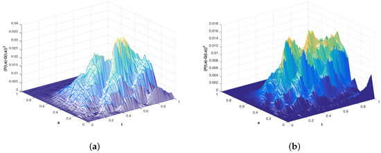 Sample paths produced by the square of the difference between (a) “explicit solution" and (b) numerical solution under and , respectively (78).