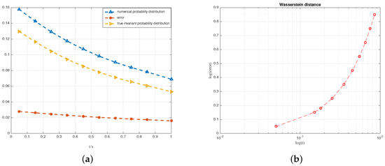 In addition, it is not difficult to verify that system (78) has a unique invariant probability measure. However, for system (78), its true solution is almost impossible to find. Therefore, let the EM method generate the empirical distribution as the true invariant probability distribution. Inspired by [33], the statistic of the Kolmogorov–Smirnov test can be used to estimate the difference between two distributions. First, we choose 200 independent paths of (78) to simulate with from to . We can easily obtain 10 paths after averaging at time . The yellow line in Figure 3a describes the empirical distribution, which is constructed by 10 points at . The blue line in Figure 3a represents the numerical invariant probability distribution generated by the EM method. The red line in Figure 3a shows that the error between the numerical invariant measure (i.e., numerical probability distribution) and the true invariant measure (i.e., true invariant probability distribution) gradually decreases with increasing time (t). Next, based on Figure 3, i.e., , the log(error) plot of the differences between the numerical and true invariant probability distributions with step sizes is shown in Figure 3b. Obviously, it is not difficult to conclude that as the step size becomes smaller, the Wasserstein distance also decreases, tending toward 0.