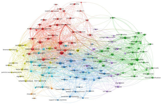 The current study uses a retrieval strategy to perform a keyword co-occurrence analysis through VOSviewer. The search query “mining/mine slope evaluation/assessment” is employed to query the Web of Science database. As illustrated in Figure 1, the current evaluations of slopes predominantly focus on safety or stability, with less emphasis on the ecological restoration suitability of mining slopes. However, following a series of mining activities, the surrounding ecological environment becomes fragile, and rock structures are fractured. This mining process parallels the seismic hazards experienced by urban buildings, resulting in devastating impacts. An evaluation of the suitability of ecological restoration will help to select appropriate restoration measures to ensure that the surrounding ecological environment can be effectively restored and protected [14]. Therefore, the ecological restoration suitability of slopes should also be included in the evaluation object, as well as safety, to ensure the stability and health of their surrounding ecological environment. This paper combines safety and ecological evaluations of abandoned open-pit mine slopes to comprehensively evaluate slope resilience from two dimensions based on the resilience theory. Resilience was initially used to describe the mechanical properties of metals. It was later applied to systems ecology [15,16,17] to describe the ability of ecosystems to maintain normal functioning or restore balance after being damaged. The resilience evaluation encompasses both risk and recovery assessments. In 2020, China adopted the construction of “resilient cities” as a national sustainable development strategy. The continuous development of the resilience theory has made exploring cities’ or systems’ ability to cope with destruction a hot topic in disaster prevention and mitigation [18], spanning various applications such as deep foundation pit construction [19], buildings [20], critical infrastructure systems [21], urban systems [22,23], bridges [24], etc. Based on this, an evaluation of the slope resilience of abandoned open-pit mines can be based on two dimensions: slope safety and slope ecological restoration suitability. This has significant theoretical and practical significance for safety management and ecological environment restoration.