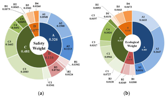 where Equation (3) is the objective function in the objective optimization model; w U is the optimal subjective weight of each assessment indicator; W i j denotes the judgment range when indicator i and indicator j are compared; and W i j = [ w U i l w U j r , w U i r w U j l ] . w U i and w U j are the optimal subjective weights of indicator i and indicator j, respectively, and D ( A i j , W i j ) is the degree of divergence of intervals A i j and W i j . When the optimal subjective weight is taken for both indicator i and indicator j, D ( A i j , w U i w U j ) denotes the degree of divergence of the point w U i w U j to interval A i j .