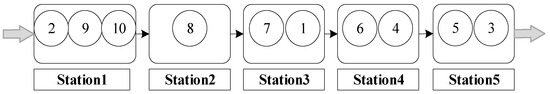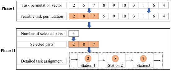 For the instance illustrated in Figure 1, where the task permutation vector in the encoding is [2, 5, 7, 8, 9, 10, 3, 1, 6, 4] and the number of removed parts in the encoding is 3, Figure 3 illustrates the process of the two-phase decoding process. Since the task permutation vector may not satisfy the precedence relation constraint, Phase I first transforms the task permutation vector into the feasible task permutation. Specifically, following the process of Phase I, the procedure of achieving the first three tasks in the feasible task permutation is as follows. For the first task, the set of assignable tasks contains tasks {2, 3}, and task 2 is assigned to the feasible task permutation because of its former position in the task permutation vector. For the second task, the set of assignable tasks contains tasks {1, 3, 8, 9, 10}, and task 8 is assigned to the feasible task permutation because of its former position in the task permutation vector. For the third task, the set of assignable tasks contains tasks {1, 3, 4, 7, 9, 10}, and task 7 is assigned to the feasible task permutation because of its former position in the task permutation vector. The above steps are repeated until a feasible task permutation [2, 8, 7, 5, 9, 10, 3, 1, 6, 4] is formed. In Phase II, since the number of selected parts is 3, the first 3 tasks in the feasible task permutation are selected for execution, which are 2, 8 and 7. Subsequently, these selected tasks are assigned to the 3 stations sequentially while satisfying the cycle time constraint to achieve the final task assignment scheme.