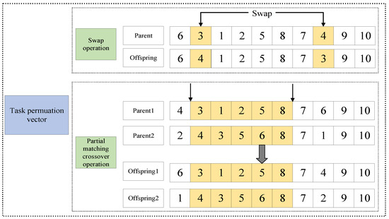 Specifically, the swap operation randomly selects two different positions on the operation sort vector and then exchanges the values of these two positions. The partially mapped crossover operator combines two parents to generate two offspring. As the partially mapped crossover operator has been widely utilized, a detailed description is omitted here, and readers can refer to Goldberg and Lingle Jr [31] for a detailed description. Figure 4 illustrates the swap operation and the partial match crossover operation for the task permutation vector.
