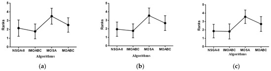 Mean rankings and 95% confidence intervals for algorithmic indicator values. (a) Ranks of algorithms in terms 1-HVR; (b) Ranks of algorithms in terms ; (c) Ranks of algorithms in terms IGD.