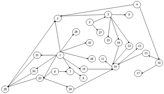 This section optimizes a disassembly line of used drum washing machines for an electronic disassembly company in the northeast region of China. This drum washer disassembly line contains 28 tasks with a cycle time of 30, where the cost of running a station per unit of time is 0.05 and the fixed start-up cost of each station is 1. The operation time of the tasks, the recycling value of parts, the costs of performing tasks, as well as the value of saved carbon emission by part and the value of carbon emission generated by the disassembled parts are shown in Table 8. Meanwhile, Figure 6 demonstrates the precedence relations between the tasks in this disassembly line.