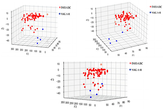 Figure 7 shows the multi-perspective spatial distribution of the Pareto front on the objective function in a single run of the two algorithms. From the figure, it can be seen that the Pareto solutions achieved by the IMOABC dominate the Pareto solutions by NSGA-II. Meanwhile, it is also observed that the IMOABC obtains more Pareto solutions and that the Pareto solutions obtained by the IMOABC have the better distribution. Hence, it could be concluded that the proposed IMOABC outperforms NSGA-II in this real case.