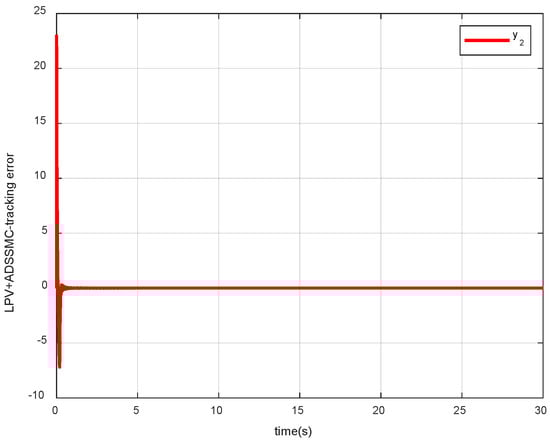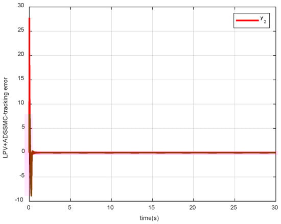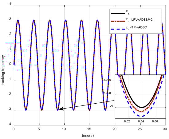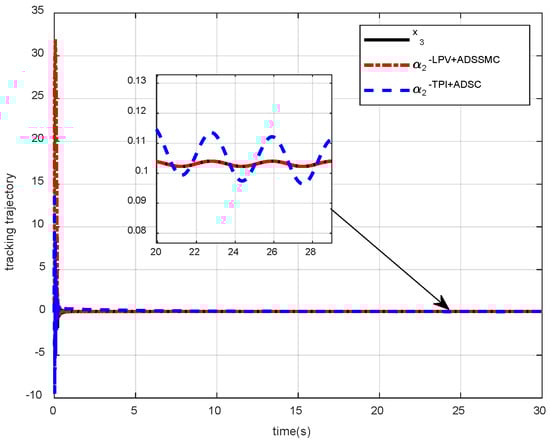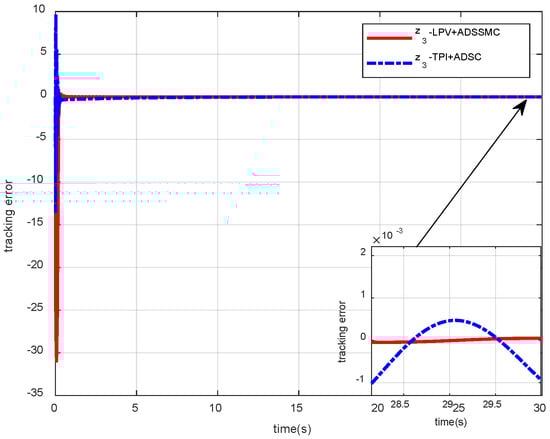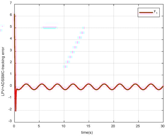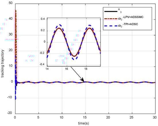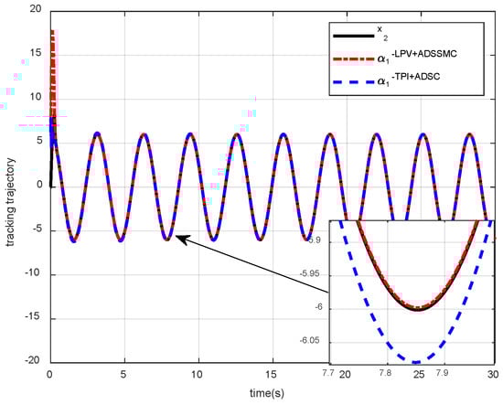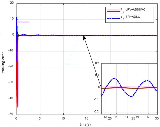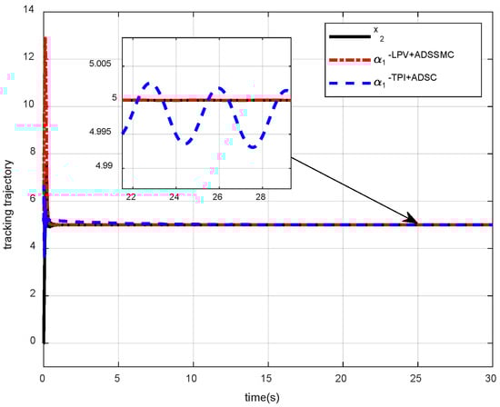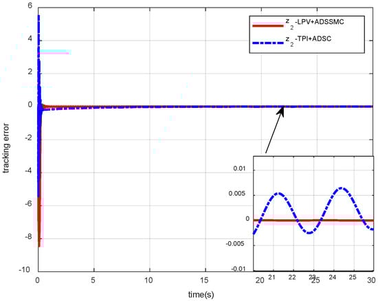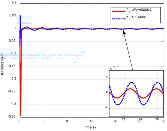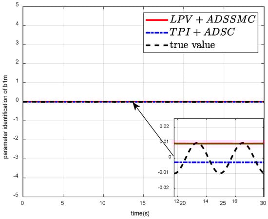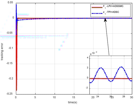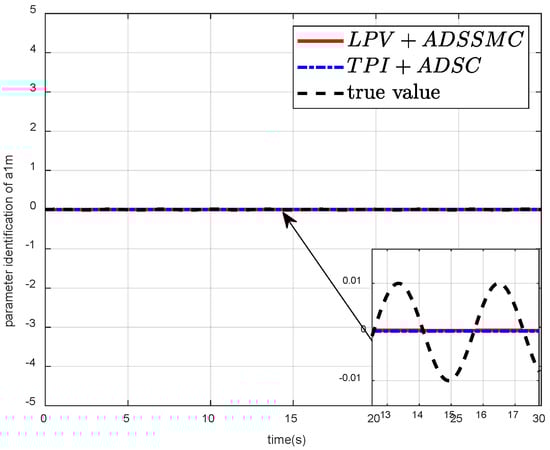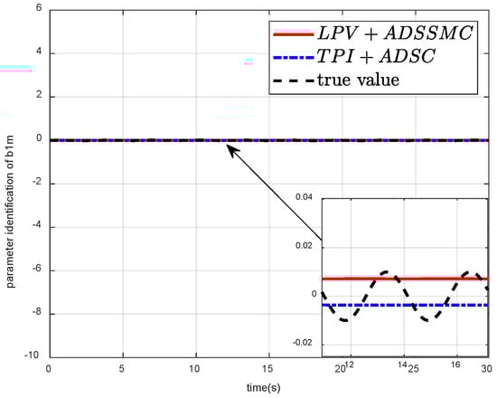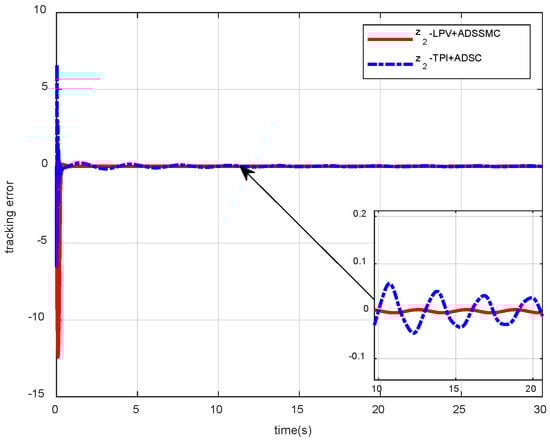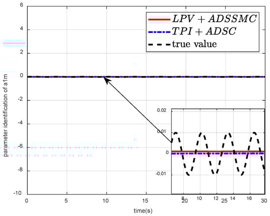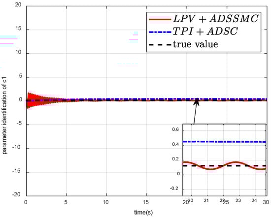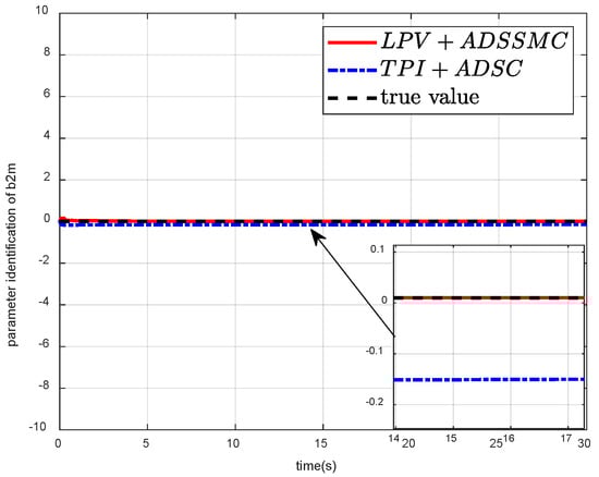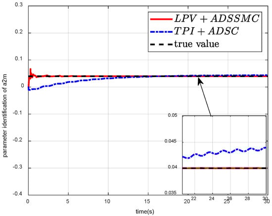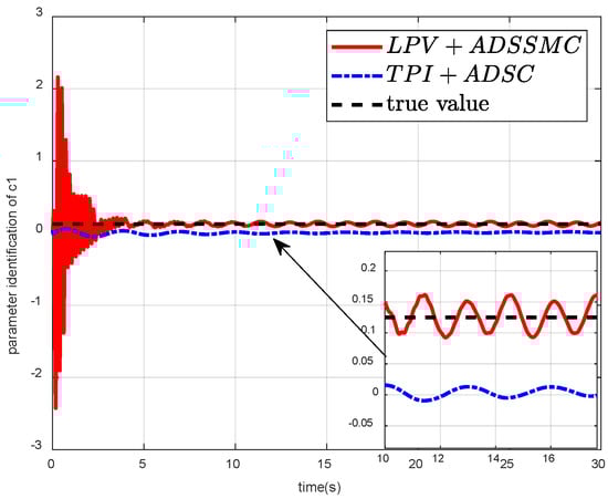 Case 1: The reference signal is given as . Figure 1 and Figure 2 demonstrate the tracking trajectory and tracking error of LPV and TPI systems. In Figure 1, the tracking error of the state variable is compared under the reference signal . It is evident from the figure that TPI+ADSC exhibits considerable tracking error, whereas LPV+ADSSMC showcases minimal tracking error, approaching zero in a steady state, reflecting superior tracking performance. Figure 2 illustrates a comparison of the tracking trajectories of the state variable with LPV+ADSSMC displaying faster convergence speed and higher tracking accuracy compared to TAI+ADSC. Additionally, Figure 3 compares the error of the state variable and virtual control law under two distinct methods, indicating that LPV+ADSSMC incurs smaller errors. Furthermore, Figure 4 contrasts the virtual control laws of the state variable under LPV+ADSSMC and TPI+ADSC methods, demonstrating the superior tracking performance of the proposed method. Figure 5 and Figure 6 further compare the state variable and virtual control laws under the two methods, with LPV+ADSSMC showing remarkable tracking effectiveness and minimal tracking error, while TPI+ADSC exhibits larger errors with fluctuations. Figure 7, Figure 8, Figure 9, Figure 10, Figure 11 and Figure 12 compare the estimation results of unknown parameters under LPV+ADSSMC and TPI+ADSC methods, revealing the effectiveness of the adaptive dynamic surface control method integrated with LPV+ADSSMC state observer. The parameter convergence effect of LPV+ADSSMC is highlighted, ensuring continuous adaptation to real parameter values, whereas TPI+ADSC exhibits significant convergence errors and fluctuations. Figure 13 and Figure 14 showcase controllers and , while Figure 15 and Figure 16 depict the tracking errors of virtual control laws and in the low-pass filter versus and , confirming the validity of the virtual control law.