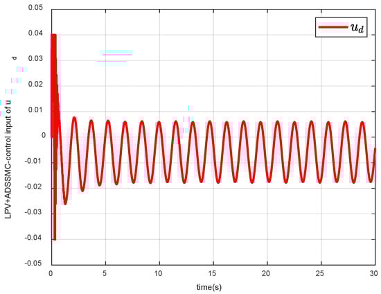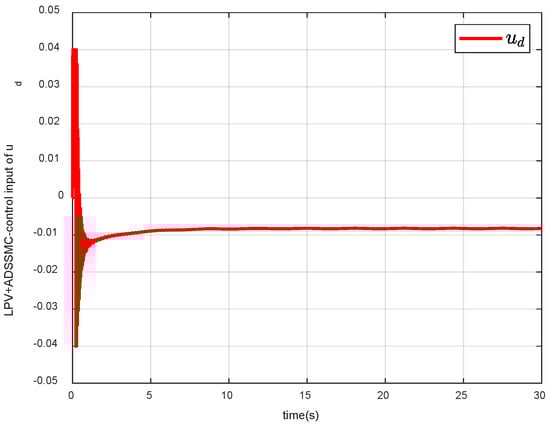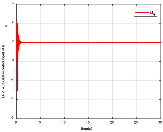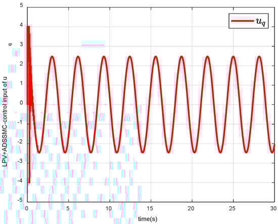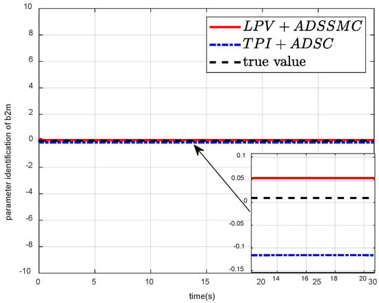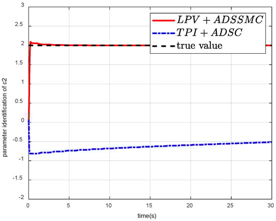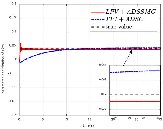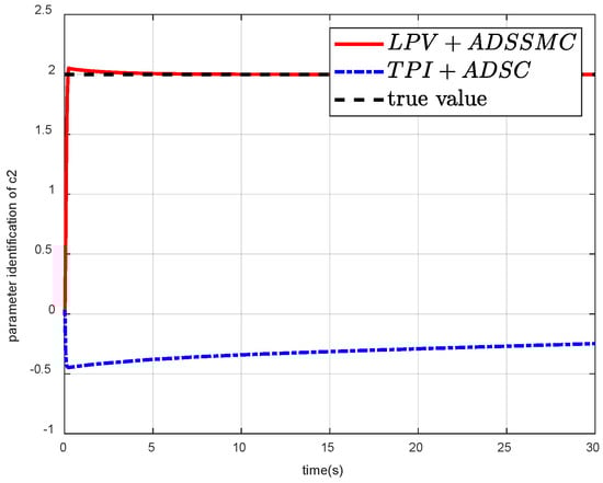 Case 2: The reference signal is set as for the purpose of examining performance under changing reference signals. Figure 17, Figure 18, Figure 19, Figure 20, Figure 21 and Figure 22 depict the tracking trajectories and errors of state variables using the LPV+ADSSMC and TPI+ADSC techniques. Analysis of Figure 17, Figure 18, Figure 19, Figure 20, Figure 21 and Figure 22 reveals that LPV+ADSSMC exhibits superior tracking capabilities compared to TPI+ADSC in response to signal variations. The parameter estimation outcomes for LPV+ADSSMC and TPI+ADSC are presented in Figure 23, Figure 24, Figure 25, Figure 26, Figure 27 and Figure 28. Notably, Figure 23, Figure 24, Figure 25, Figure 26, Figure 27 and Figure 28 demonstrate that the LPV+ADSSMC parameters can converge accurately to their true values with high precision upon signal variations. Conversely, the TPI+ADSC parameter identification results exhibit inaccuracies and substantial jitter during the convergence process. Furthermore, Figure 29 and Figure 30 illustrate tracking errors of virtual control laws and in a low-pass filter in comparison to and . Figure 31 and Figure 32 display controllers and . The results of the simulation experiments show that the utilization of the dynamic surface sliding mode control technique with an LPV+ADSSMC observer for a PMSM allows for the accurate estimation of system parameters and promotes effective tracking control with high performance.