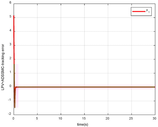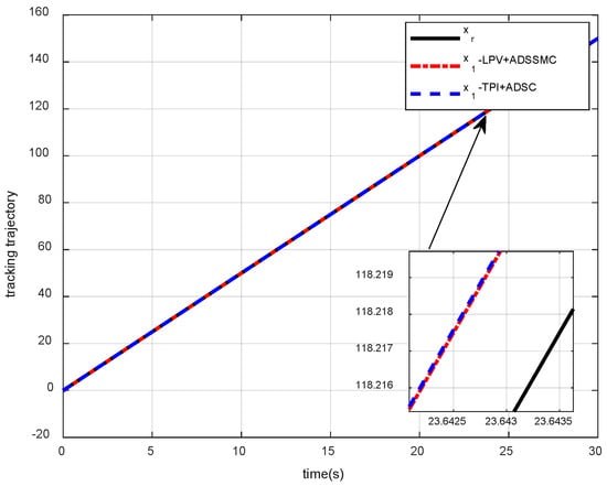 We set the initial parameters’ conditions for the experiment. The system parameters were as follows: , , , , , , ; , , , , , ; the control parameters of LPV+ADSSMC were given as follows: , , , , , , , , , , , ; for fair comparison, the parameters of TPI+ADSC were set to be the same: , , , , , , , , , ; and the initial condition was as follows: , , , , . In light of the saturation constraints of the system, the control inputs and were restricted to and , respectively.