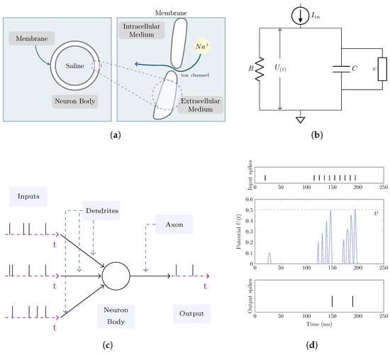 Louis Lapicque [] observed that a spiking neuron can be analogously likened to a low-pass filter circuit, comprising a resistor (R) and a capacitor (C). This concept is referred to as the leaky integrate-and-fire neuron model. Even in the present, the idea remains valid. Physiologically, the neuron’s capacitance arises via the insulating lipid bilayer constituting its membrane, while the resistance is a consequence of gated ion channels regulating the flow of charged particles across the membrane (see Figure 2b).