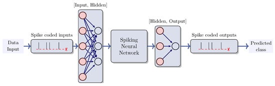 SNN pipeline. The input data for an SNN may undergo transformation into a firing rate or alternative encodings to produce spikes. Subsequently, the model is trained to accurately predict the correct class by employing encoding strategies, such as the highest firing rate or firing first, amongst other options.