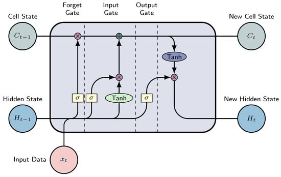 These networks consist of LSTM modules, which are a specialized type of recurrent neural network introduced in 1997 by Hochreiter and Schmidhuber []. They consist of three internal gates, known as the input, forget, and output gates, which are detailed in Figure 4.