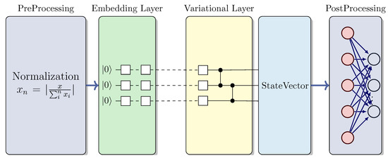 Figure 7 depicts the overall structure of a VQC. This hybrid approach involves the following stages []: