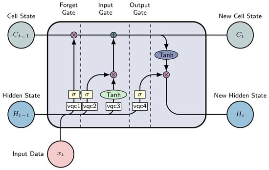 This architecture is replicated for each time step considered in the prediction. The ultimate layer of this model is a linear layer responsible for converting the hidden state into the ultimate prediction. The quantum counterpart of this neural network is constructed with a VQC model for each gate as Figure 5 shows. Finally, we summarize the Lstm implementation steps as follows: