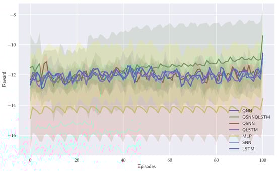 Quantum machine learning has arisen as an intriguing focal point within the scientific community. Notably, variational quantum circuits (VQC), also know as quantum neural networks (QNN), have exhibited success across various domains, including unsupervised learning [] and supervised learning [,,]. Although research on quantum reinforcement learning (QRL) is still in its nascent stages, recent studies have showcased that QNNs can surpass classical models in reinforcement learning (RL) for energy-efficiency scenarios. They achieve superior cumulative rewards while requiring fewer parameters to be learned [,].