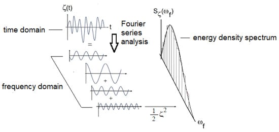 The wave energy spectrum is the distribution that represents each frequency’s contribution to an irregular sea’s energy. Figure 3 gives a graphical interpretation of the meaning of a wave spectrum and how it relates to the waves. The irregular wave history in the time domain, , function of the time t, can be expressed via Fourier series analysis as the sum of many regular wave components, each with its frequency, amplitude, and random phase in the frequency domain. The value ½, associated with each wave component is plotted vertically, representing the wave energy spectrum .