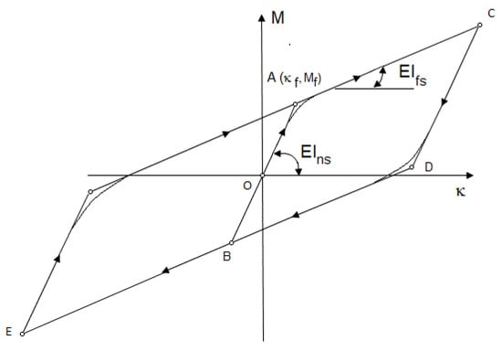 If cyclic bending loads with curvatures below the critical threshold are imposed on the pipe, the relationship between the bending moment and curvature follows a linear pattern (depicted as path OAB in Figure 4). On the other hand, surpassing the critical curvature results in a nonlinear relationship between the bending moment and curvature, which can be approximated by either the bilinear curve illustrated in Figure 4 (path OAC) or a multilinear curve [17]. During unloading, when the curvature is reversed, internal friction initially prevents the armors from sliding as axial forces, induced by the imposed curvature, decrease. The tensile armors undergo reloading after surpassing a curvature equivalent to the critical value. A new curvature increment equal to the critical value triggers their relative slide (depicted as path CDE in Figure 4). This mechanism induces a hysteresis loop in which the area between the parallel lines shown in Figure 4 is proportional to the energy dissipation by friction.