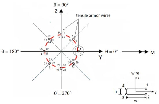 Finally, considering Equations (7)–(22), the stresses due to bending in a tensile armor located at an angular position (Figure 5) are given by: